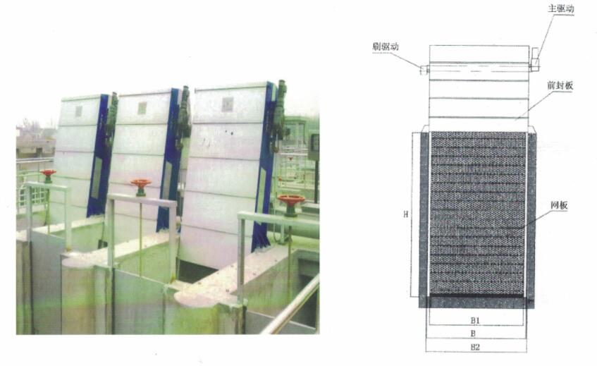 机架由碳钢或不锈钢制成整体结构,其内壁两侧设有导轨,头部安装主轴及驱动装置。网板链由网板与牵引链组装而成,为全不锈钢材质,网板上开有过水小孔。运行时,一-部分纤维杂物由水力附着在网板上,块状及颗粒状(如木块、果壳等)垃圾聚集在台阶上,网板提升时,不断地将垃圾从水中分离出来。通过设置于背部的高效清洗刷,将绝大部分杂物刷入输送机中,并可通过自动冲洗装置对网板表面喷射冲洗,使网孔再生。